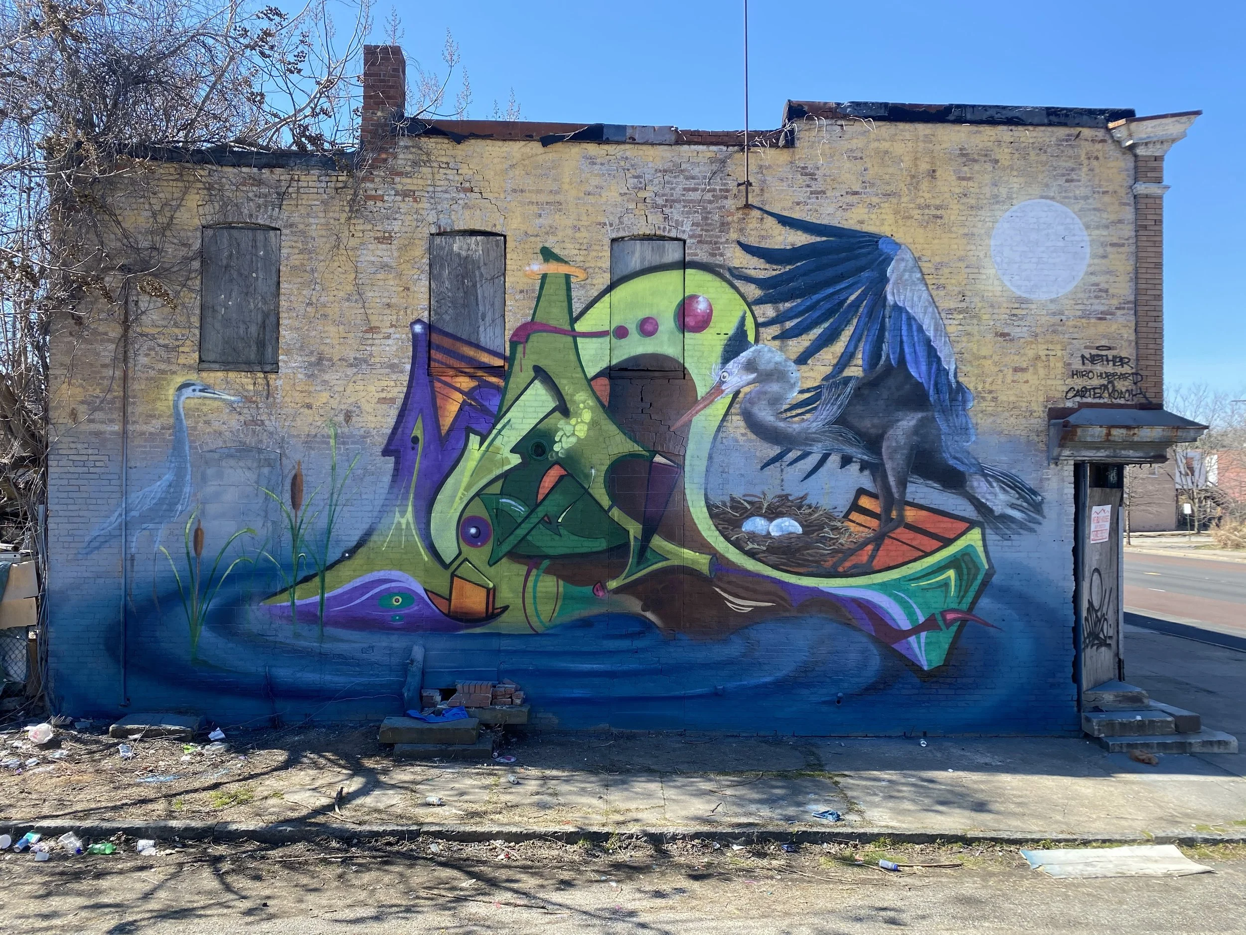 In an effort to bring beauty to some of the largely vacant neighborhoods in Baltimore, Maryland my friends Nether, Hiro Hubbard and I painted a series of three murals in different neighborhoods around the city. The focus was providing viewers with a window into the beauty of the natural world with a touch of surrealism to intrigue and inspire. In this 17’ x 33’ mural a mysterious object has landed in a Maryland marsh and the curios local wildlife has started to interact with it. Painted with a combination of acrylic latex and spray paint.